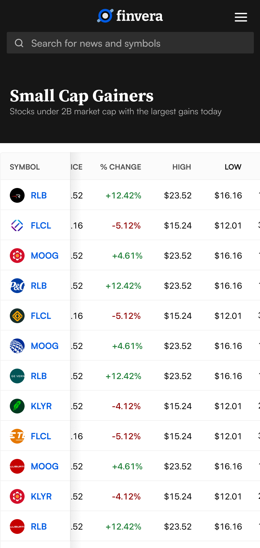 The site needed to communicate Finvera's value as a provider of small-cap news, data, and market sentiment without overwhelming the reader. The goal was to position Finvera as the resource for understanding why small-caps move and where they're headed next. I explored several layout directions before landing on a structure that felt both scannable and editorial, somewhere between a financial dashboard and a news front page.