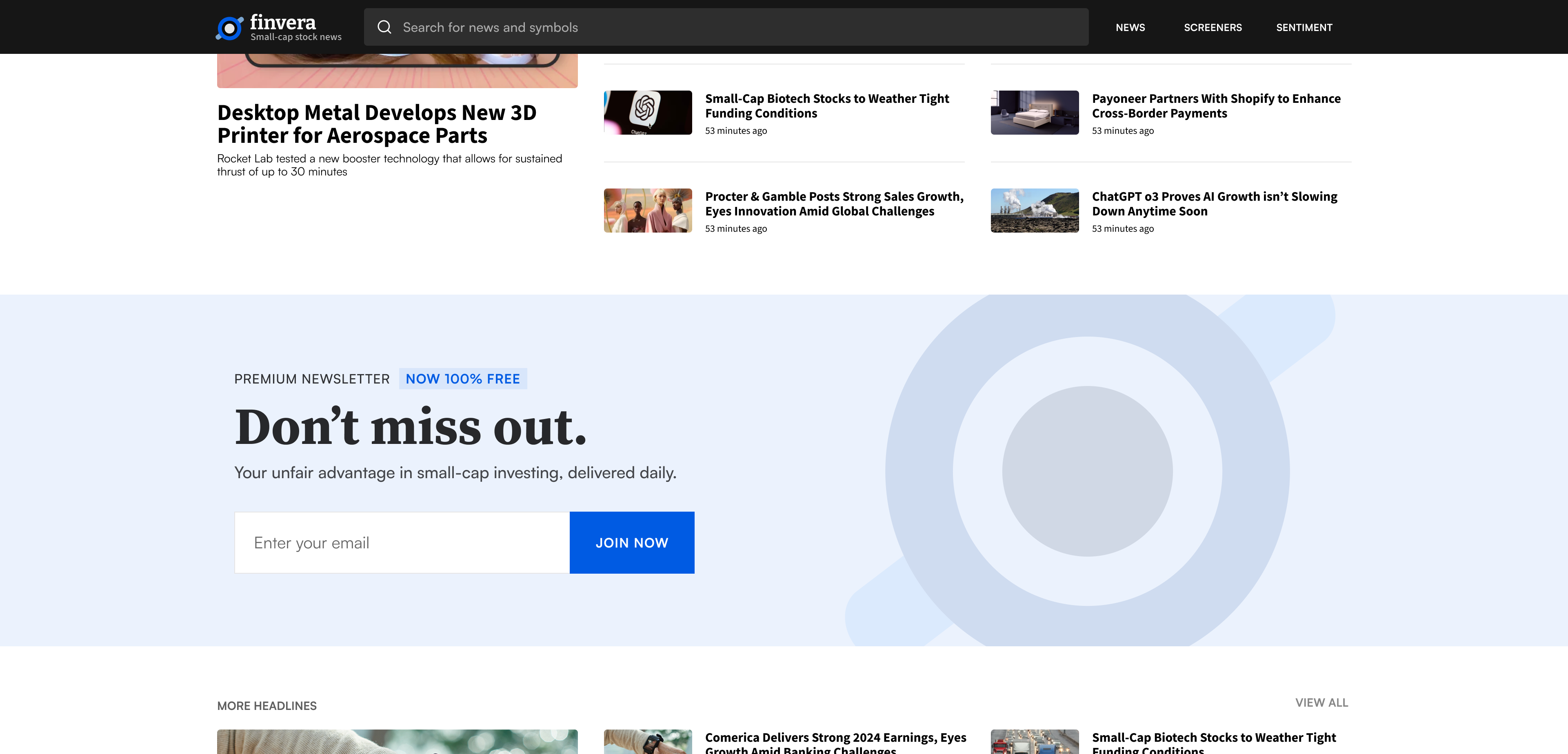 The solution was a set of promotional banners, visually consistent with the site's design language, that framed our newsletter as an exclusive resource: "Your unfair advantage in small-cap investing, delivered twice weekly." "Get Finvera's premium newsletter 100% free." The promotions were prominent but never distracting or intrusive. And beneath the email input field, a short line read: "We respect your inbox - no spam, ever." Once a user had read three articles, a soft freewall prompted them for their email before unlocking additional content.