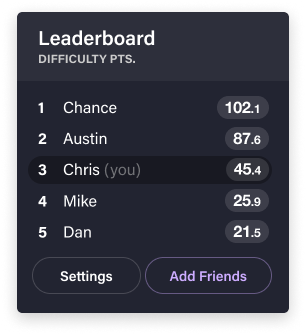 The social layer is what pushes tracking from useful to sticky. A leaderboard ranks players by difficulty points — not just trick count — so someone who's landed fewer but harder tricks can still compete. Spider charts let you compare your strengths across different trick categories against friends, showing where you're strong and where you might want to branch out.