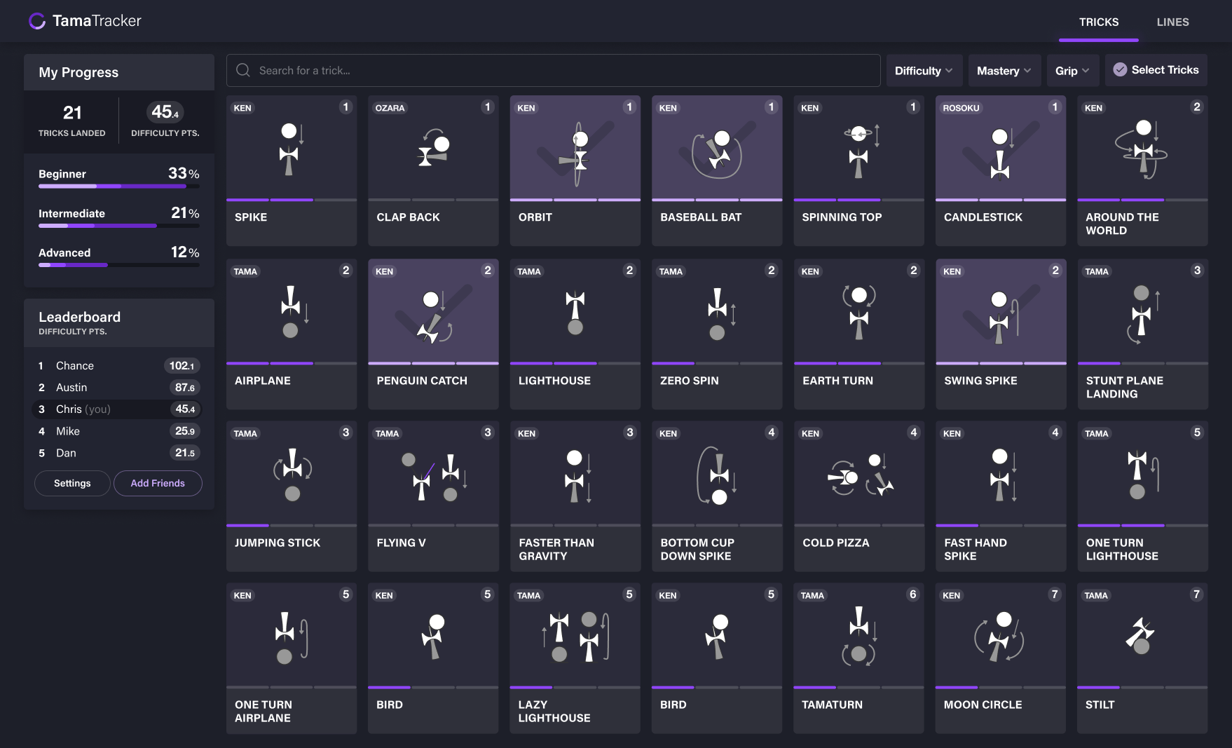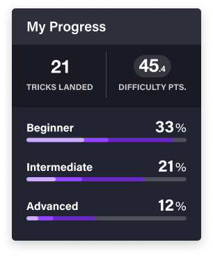 The app does three things: it tracks your progress across 70+ tricks with a gamified scoring system, it lets you compare stats with friends on a leaderboard, and it helps you discover what to learn next based on what you've already done. Each trick has a difficulty score, so the leaderboard isn't just "who has the most tricks" — it's weighted by how hard they are.