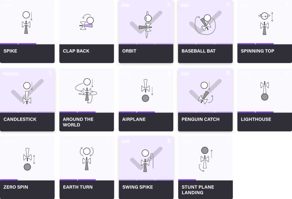 Every trick has a custom illustration showing the kendama's position and motion. At rest, the illustration communicates the trick at a glance — on hover, it animates to show what the trick actually looks like in motion. This matters because trick names alone aren't always descriptive, especially for players exploring new territory. The illustrations make browsing intuitive: you can scan a grid of tricks and understand what each one involves without reading a description.